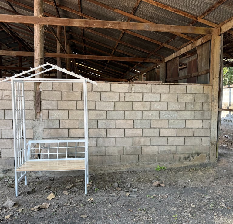This prayer path is being created through the shared effort of the community and those who walk alongside it. Visiting short-term mission teams have begun murals and early groundwork, volunteer teams came to help prepare the land, and individuals have generously donated plants and materials. Family Fellowship has also provided the first bench, archways, and gravel at the entrance of the path. As this work continues, we invite others to join—through giving, creating, building, and serving—to help shape a place that will bless many for years to come.